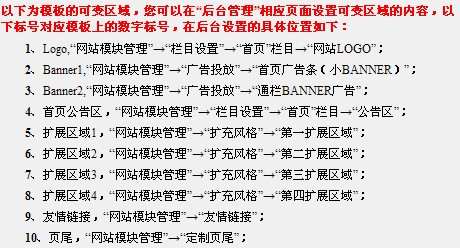 在上一步出現(xiàn)的頁(yè)面的上半部分有您正在使用的模板的布局圖(標(biāo)示有1,2,3……10的紅色數(shù)字,如圖四),下半部分的使用說(shuō)明中有紅色數(shù)字所在的區(qū)域的名稱及設(shè)置步驟(如圖五):